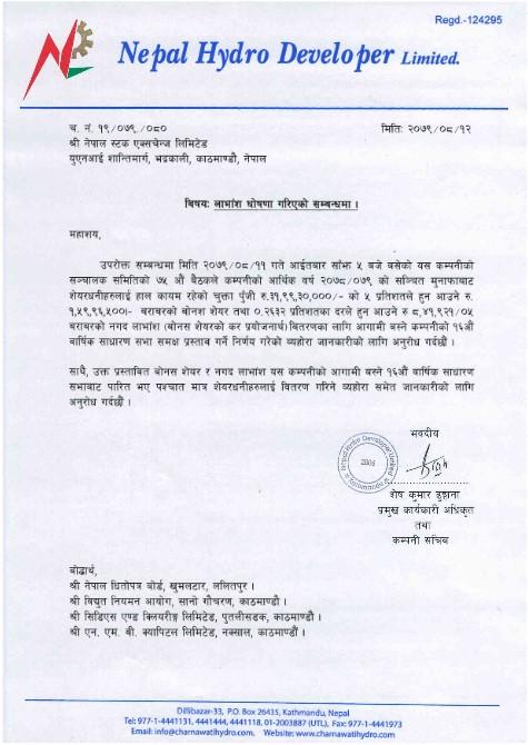 काठमाडौं । नेपाल हाइड्रो डेभलोपर कम्पनीले ५ प्रतिशत बोनस सेयर दिने घोषणा गरेको छ ।