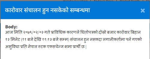 ‘आज मिति २०७९/०२/०३ गते प्राविधिक कारणले धितोपत्रको दोस्रो बजार कारोबार बिहान १३ मिनेट (११ बजेदेखि ११ः१३ बजेसम्म) संचालन हुन नसक्दा लगानीकर्ताहरुमा पर्न गएको असुविधा प्रति नेपाल स्टक एक्सचेन्ज क्षमा प्रार्थी छ’- नेप्सेद्वारा जारी सूचनामा भनिएको छ ।