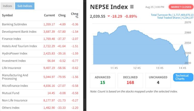 काठमाडौं । साताको पाचौं कारोबारको दिन आज सेयर बजार परिसूचक (नेप्से) १८ दशमलव ३० अंकले ओरालो लागेको छ। आज सेयर बजार परिसूचक नेप्से १८ दशमलव २९ अंकले घटेर दुई हजार ३९ दशमलव ५५ विन्दुमा झरेको छ ।