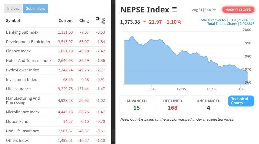 आज १३ वटा समूहको कारोबार भएकोमा १३ वटै समूहरुको सूचक घटेर नेप्से पुरै रातो देखिएको छ । यो मध्ये वाणिज्य बैंक समूहको सूचक सात दशमलव सात अंकले घटेर एक हजार तीन सय ३० दशमलव ९९ अंकमा झरेकोमा विकास बैंक समूहको सूचक ६५ दशमलव ९७ अंकले घटेर तीन हजार पाँच सय १३ दशमलव ९७ अंकमा झरेको छ ।