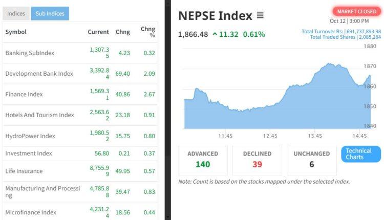काठमाडौं । साताको दोस्रो र तेस्रो दिन दोहोरो अंकले घटेको सेयर बजार परिसूचाक (नेप्से) चौथो कारोबार दिन आज भने बढेको छ । नेप्से आज ११ दशमलव ३२ अंकले बढ्दै १ हजार ८ सय ६६ दशमलव ५२ अंकमा उक्लिएको हो ।