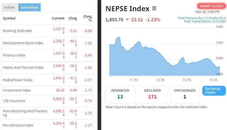 आज सबै उपसमूह घटेका छन्। बैंकिङ ९ अंक, विकास बैंक ४८, फाइनान्स ३८, होटल तथा पर्यटन २८, जलविद्युत् ४१, जीवन बीमा ६९, उत्पादन ६३, माइक्रोफाइनान्स ५०, निर्जीवन बीमा ८८, अन्य ३३ र ब्यापार उपसमूह २१ अंकले घटेका छन् ।