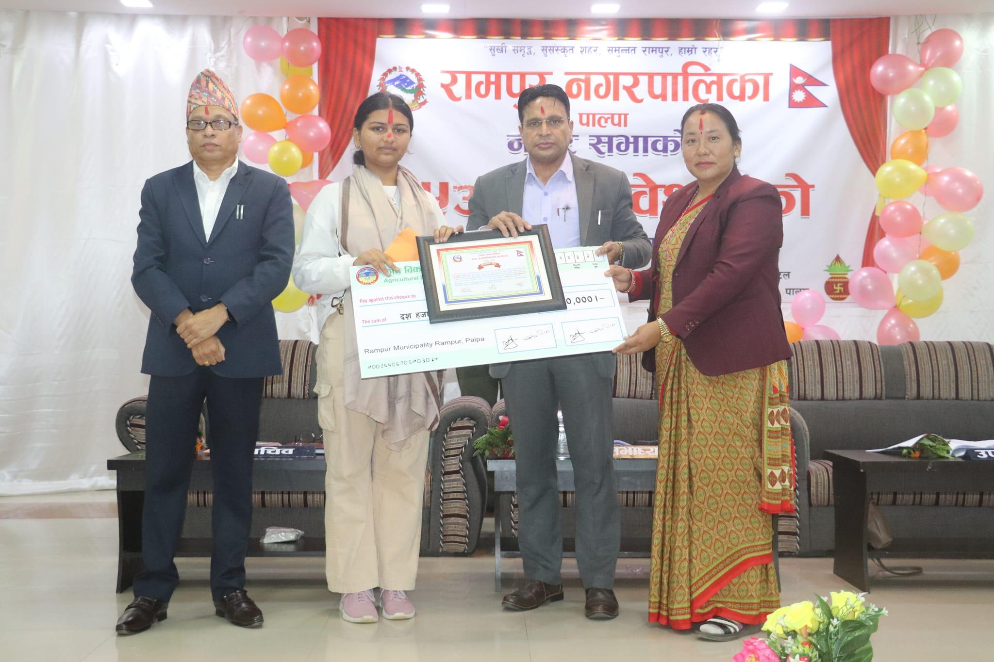 सभाको अवसरमा रामपुर नगरपालिकाले माध्यमिक शिक्षा परीक्षा (एसईई) जिल्लामै उत्कृष्ट अंक ल्याउन सफल विद्यार्थी र विद्यालयलाई सम्मान गरेको छ । नगरको नमुना विद्यालय दरैठाँटी माध्यमिक विद्यालयबाट चार जीपीए ल्याउन सफल छात्रा पूर्णिमा लक्ष्मी कुँवरलाई नगदसहित सम्मान गरेको हो । कुँवरलाई नगर प्रमुख, उपप्रमुख, प्रमुख प्रशासकिय अधिकृतले नगद १० हजार र सम्मानपत्र सहित दोसल्ला ओढाई सम्मान गरेका छन् । सिङ्गो नगरको गरिमा उच्च बनाउन सफल भएको भन्दै नगरपालिकाले सम्मान गरेको हो ।