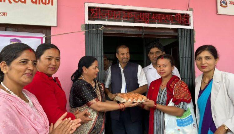 वालिङ । वालिङ नगरपालिकाकी उपप्रमुख कविता तिवारी विहिवार जगतभञ्याङमा हजार दिनका सुत्केरी आमाहरुलाई पोषिलो खानेकुरा सहितको झोला बोकेर उनीहरुलाई भेट्न पुगिन् । काखमा बच्चा बोकेका आमा तथा गर्भवती महिलाहरु स्वास्थ्य संस्थामा भेला भएका थिए । वालिङ नगरपालिकाको पोषण सुधार कार्यक्रम अन्तर्गत उपमेयर संग पोषिलो झोला कार्यक्रमको भेला थियो ।