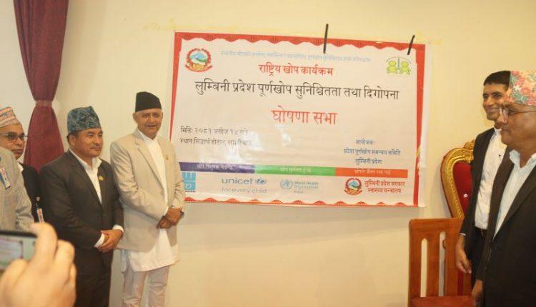 लुम्बिनी प्रदेशमा आर्थिक वर्ष २०८०/८१ रणनीति अनुसार १६ देखि ५९ महिनाका १३० शून्य मात्राका र २ हजार ३४३ खोप लगाउन छुटेका बालबालिकालाई खोजी गरेर पूर्ण खोप लगाइएको छ । लुम्बिनी प्रदेशमा २ लाख ६२ हजार ८५६ जना बालबालिकाले पूर्णखोप पाएको सुनिश्चित गरिएपछि पूर्णखोप सुनिश्चित प्रदेश घोषणा गरिएको हो ।