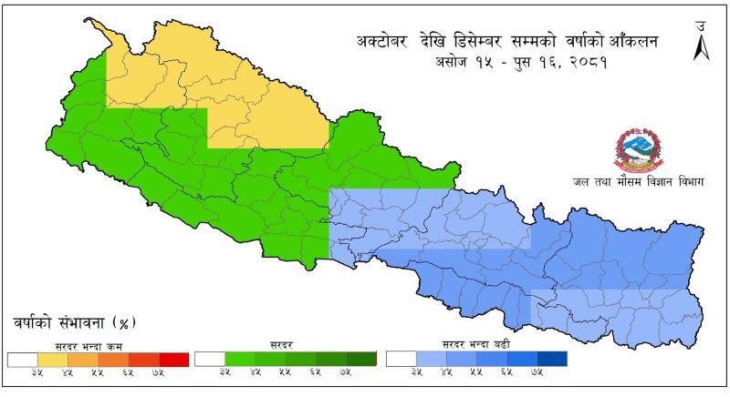 त्यसैगरी कर्णाली प्रदेशका मध्य तथा उत्तरी भाग र सुदूरपश्चिम प्रदेशका उत्तरी भागमा सरदरभन्दा कम वर्षा हुने सम्भावना ३५ देखि ४५ प्रतिशत र देशका बाँकी भागमा सरदर वर्षा हुने सम्भावना ३५ देखि ४५ प्रतिशत नै रहेको विवरणमा उल्लेख छ ।
