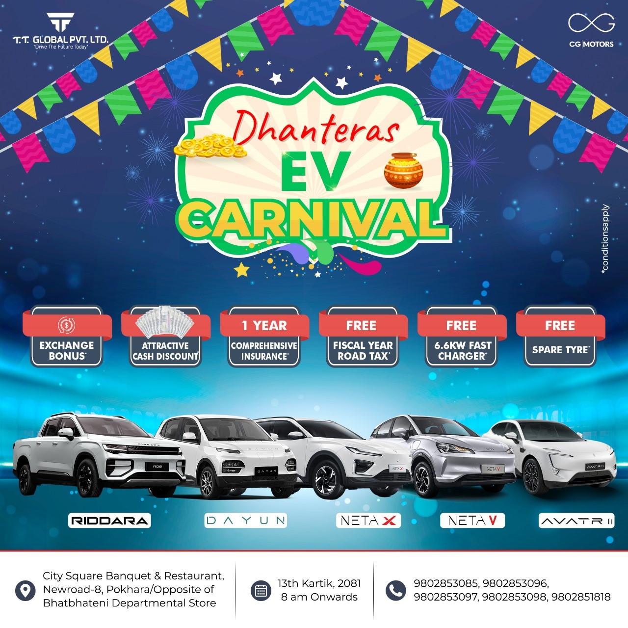नेपाली बजारमा नेटा, दायुन, रिड्डारा र अवतारका आधिकारिक वितरक, सि.जी. मोटर्सका आधिकारिक विक्रेता टि.टि. ग्लोबलले कात्तिक १३ गते धनतेरसको दिन कार्निभल गर्न लागेको हो ।