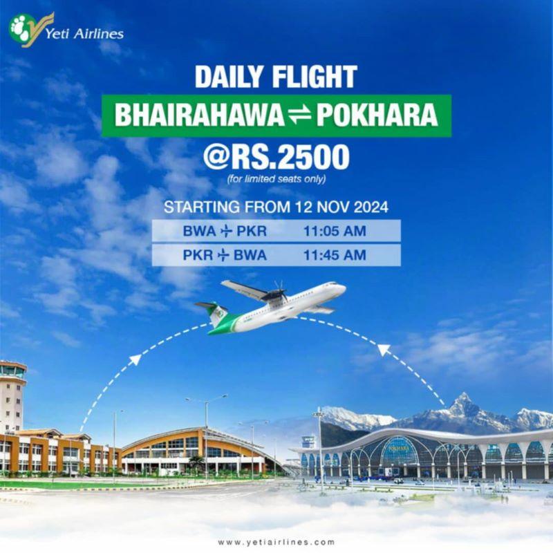 गौतमबुद्ध अन्तर्राष्ट्रिय विमानस्थलमा यात्रुहरुको संख्या वृद्धि गर्न टेवा पु¥याउने उद्देश्यले भैरहवा–पोखरा प्रत्यक्ष उडान सुरु गरेको यती एअरलाइन्सले जानकारी दिएको छ ।