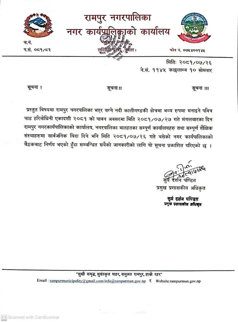 सूचनामा भनिएको, ‘रामपुर नगरपालिका भएर बग्ने नदी कालीगण्डकी क्षेत्रमा भव्य रुपमा मनाइने पवित्र चाड हरिबोधिनी एकादशीको दिन रामपुर नगर कार्यपालिकाको कार्यालय, नगरपालिका मातहतका सम्पूर्ण कार्यालयहरु तथा सम्पूर्ण शैक्षिक संस्थाहरुमा सार्वजनिक विदा दिने भनि सोमवार बसेको नगर कार्यपालिकाको बैठकबाट निर्णय भएको छ’ ।