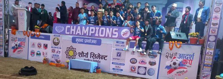 लेखनाथ । कास्कीको लेखनाथमा आयोजित २५औं आदर्श कप फुटबल प्रतियोगिता २०८१ को उपाधी एन्फा कास्कीले हात पारेको छ । लेखनाथको भण्डारढीक स्थीत लेखनाथ रंगशालामा शनिवार सम्पन्न फाईनल खेलमा सशस्त्र प्रहरीलाई २–१ को गोल अनतरले पराजित गर्दै कास्कीले उपाधि जित्न सफल भएको हो ।