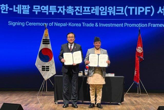 काठमाडौं । उद्योग, वाणिज्य तथा आपूर्तिमन्त्री दामोदर भण्डारी र दक्षिण कोरियाका समकक्षी इन्क्यो च्योङबीच द्विपक्षीय व्यापार तथा लगानी प्रवर्द्धन फ्रेमवर्क (टिआइपीएफ) सम्झौतामा हस्ताक्षर भएको छ । गणतन्त्र दक्षिण कोरिया र नेपालको द्विपक्षीय सम्बन्ध स्थापित भएको ५० वर्ष पूरा भएका अवसरमा आज दक्षिण कोरियाको राजधानी सोलमा उक्त सम्झौतामा हस्ताक्षर गरिएको हो ।