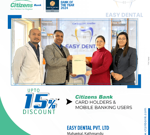 सो समझदारीपत्रमा हस्ताक्षर पश्चात् सिटिजन्स बैंकका कार्ड बाहक र मोबाइल बैंकिङ ग्राहकहरूले इजी डेन्टल प्रा. लि.मा १५% सम्मको आकर्षक छुट पाउने छन् । यस किसिमको सहकार्यबाट बैंकका ग्राहकहरु लाभान्वित हुनुका साथै नगद कारोबार बाट डिजिटल कारोबार तर्फ उत्प्रेरित हुन्े विश्वास बैंकले लिएको छ ।
