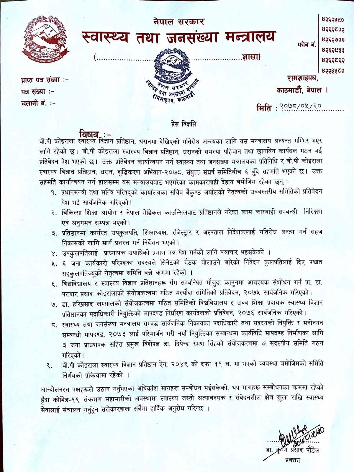 काठमाडौं । सरकारले धरानस्थित बिपी कोइराला स्वास्थ्य विज्ञान प्रतिष्ठानको नियमित सेवा प्रवाहमा अवरोध नगर्न सम्बद्ध पक्षलाई अनुरोध गरेको छ ।