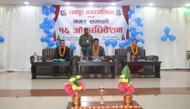 रामपुर (पाल्पा) । रामपुर नगरपालिकाको नगर सभाको १६ औँ अधिवेशन सम्पन्न भएको छ । विभिन्न योजनाको बजेट रकमान्तर तथा शीर्षकान्तर सहित स्थानीय युवा परिषद् ऐन संशोधन गर्दै नगर सभा बिहिबार सकिएको हो ।