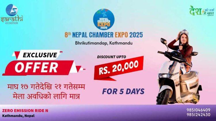 इलेक्ट्रिक स्कुटरमा आकर्षक छुट र सहज फाइनान्स सुविधासहित हरित यातायात अपनाउने सही अवसर हो । भृकुटीमण्डपमा माघ १७ देखि २१ गतेसम्म चल्ने यस एक्स्पोमा सहभागी भई अवलोकन गर्न सकिने कम्पनीले जनाएको छ ।
