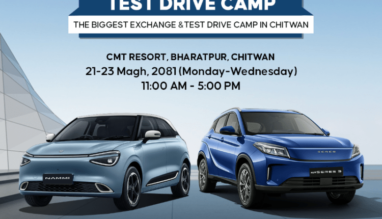 एमएडब्लु वृद्धिले चितवनस्थित भरतपुर सिमटी रिसोर्टमा २१ माघदेखि २३ गतेसम्म तीनदिने ‘एक्सचेन्ड एन्ड टेस्ट ड्राइभ क्याम्प’ को आयोजना गर्न लागेको हो । योे मेलामा इभी किन्न चाहने चितवनका ग्राहकले सेरेसमा र नामी इभी किन्दा ७ किलोवाटको चार्जर फ्रि पाउन सक्नेछन् ।
