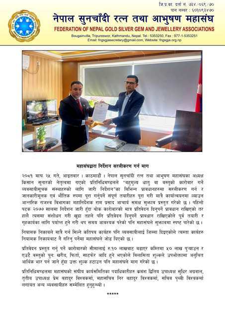 “बहुमुल्य धातु वा वस्तुको कारोवार गर्ने व्यवसायीसूचक संस्थाहरुको लागि जारी निर्देशन”का विभिन्न प्रावधानहरुमा सरलीकरण गर्न र जानकारीमूलक एवं भौतिक रुपमा पूरा गर्नुपर्ने सम्पूर्ण तयारीहरु पूरा गरी मात्रै कार्यान्वयनमा ल्याउन विभागका महानिर्देशक आचार्यसमक्ष महासंघले सुझाव प्रस्तुत गरेको छ ।