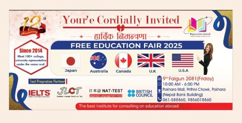पोखरा । निगाता इन्टरनेशनल ल्याङग्वेज एण्ड ट्रेनिङ इन्स्टिच्युटको आयोजनामा फागुन ९ गते शुक्रवार पोखरामा शैक्षिक मेला हुने भएको छ । १२ औं वार्षिकोत्सवको अवसरमा पहिलो पटक निःशुल्क शैक्षिक मेला हुन लागेको हो ।