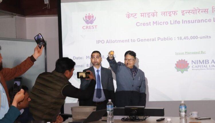 काठमाडौं । क्रेष्ट माइक्रो लाइफ इन्स्योरेन्स लिमिटेडकोे आइपिओको बाँडफाँड मंगलवार सम्पन्न भएको छ । एनआइएमबि एस क्यापिटल लिमिटेडको निष्काशन तथा बिक्री प्रबन्धकत्वमा रहेको उक्त कम्पनीको प्रति शेयर १ सय अंकित दरमा १८ लाख ४५ हजार कित्ता साधारण शेयरका लागि गत फागुन २२ देखि २६ गतेसम्म सर्वसाधारणका लागि सार्वजनिक निष्काशन तथा बिक्री खुल्ला गरिएको थियो ।