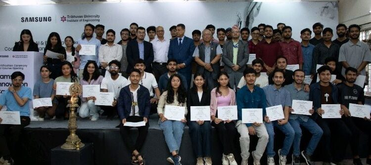 काठमाडौं । सामसङ इनोभेसनले कोडिङ र प्रोग्रामिङ कोर्सको तेस्रो ब्याच सफलतापूर्वक पूरा गरेका त्रिभुवन विश्वविद्यालय अन्तर्गत पुर्विय इन्जिनियरिङ क्याम्पसका ५६ जना विद्यार्थीलाई प्रमाणपत्र वितरण गरेको छ ।