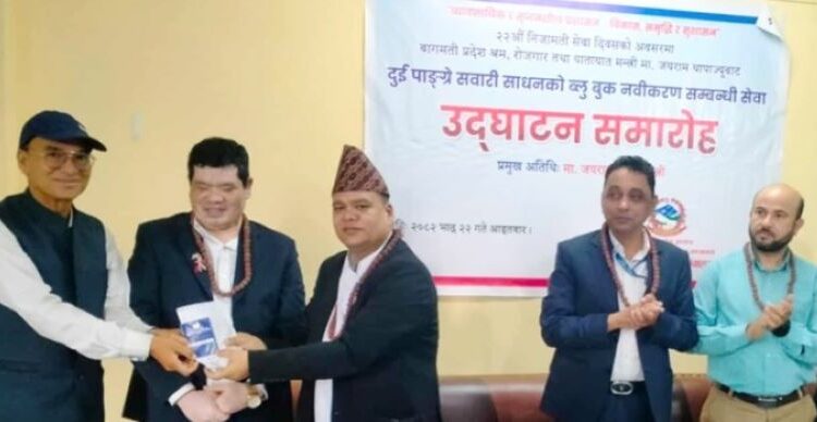 बागमती प्रदेशका श्रम, रोजगार तथा यातायातमन्त्री जयराम थापाले ब्लुबुक नवीकरण सेवाको शुभारम्भ गरेका हुन् । कार्यालयले उपलब्ध दरबन्दी अनुसार कर्मचारी सञ्चालन दैनिक १ हजार ५०० देखि २ हजार जनालाई सेवा दिन मिल्ने व्यवस्था मिलाइएको छ ।