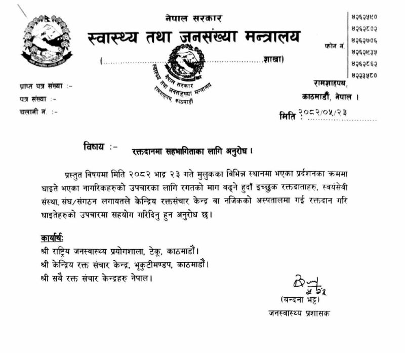 मन्त्रालयले इच्छुक रक्तदाताहरू, स्वयंसेवी संस्था, संघरसंगठनहरूले केन्द्रीय रक्त सञ्चार केन्द्र वा नजिकको अस्पतालमा गएर रक्तदान गरि घाइतेको उपचारमा सहयोग गरिदिन अनुरोध गरेको छ ।