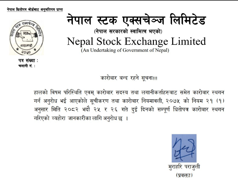 नेप्सेले सोमबार एक विज्ञप्ति जारी गर्दै भदौ २५ र २६ गते २ दिन सम्पूर्ण धितोपत्र कारोबार स्थगित गरिएको जानकारी दिएको हो ।