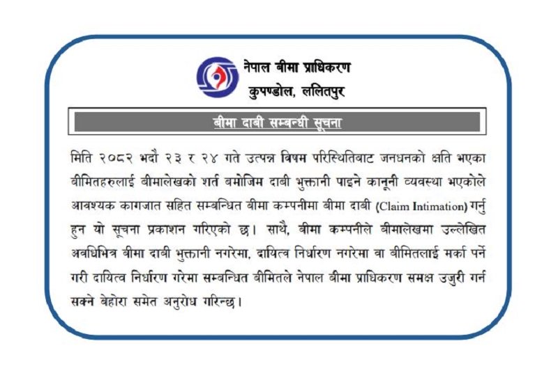 बीमितहरूले बीमालेखको सर्तबमोजिम दाबी भुक्तानी पाइने कानुनी व्यवस्था भएकोले आवश्यक कागजातसहित सम्बन्धित बीमा कम्पनीमा बीमा दाबी गर्न प्राधिकरणले आग्रह गरेको छ ।