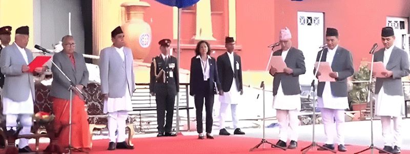 सो कार्यक्रममा प्रधानमन्त्री सुशीला कार्कीको उपस्थितिमा आज अर्थमन्त्री रामेश्वर खनाल, ऊर्जा, भौतिक योजना र सहरी विकास मन्त्री कुलमान घिसिङ र गृह र कानुनमन्त्री ओमप्रकाश अर्यालले सपथ लिएका छन् ।