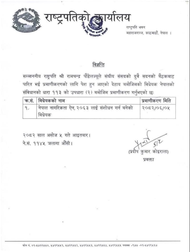 काठमाडौं । राष्ट्रपति रामचन्द्र पौडेलले नेपाल नागरिकता ऐन २०६३ लाई संशोधन गर्न बनेको विधेयक प्रमाणीकरण गरेका छन् ।