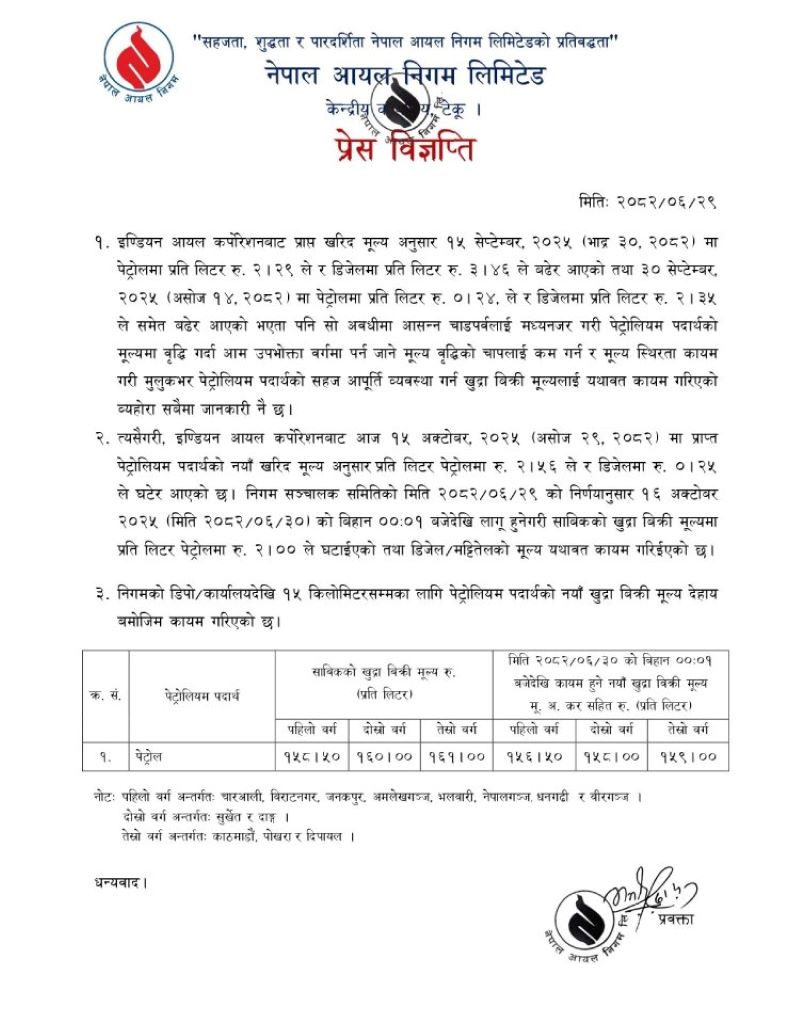 निगमले डिजेल, मट्टीतेल, हवाई इन्धन र खाना पकाउने एलपी ग्यासको मूल्य भने यथावत राखेको छ । मूल्य समायोजनसँगै पेट्रोलको मूल्य पहिलो वर्गका लागि प्रतिलिटर १५६. ५० रुपैयाँ, दोस्रो वर्गमा १५८ रुपैयाँ र तेस्रो वर्गका लागि प्रतिलिटर १५९ रुपैयाँ कायम भएको छ ।