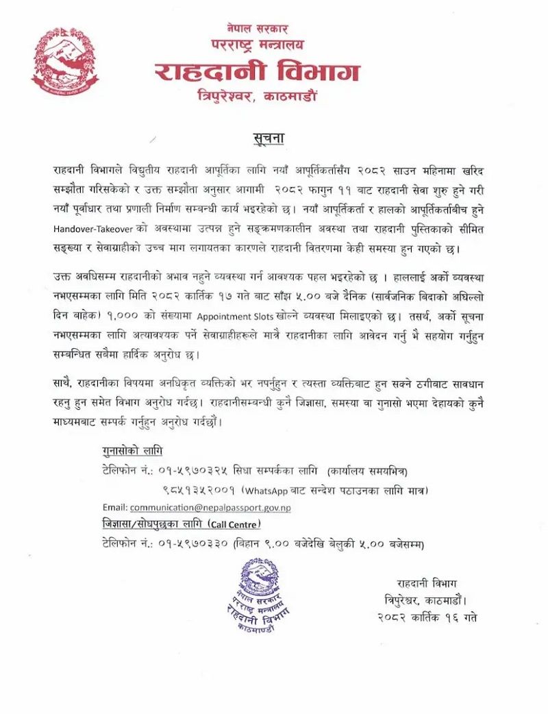 विभागले विद्युतीय राहदानी आपूर्तिका लागि नयाँ आपूर्तिकर्तासँग गएको साउनमा खरिद सम्झौता गरिसकेको र सम्झौताअनुसार आउँदो फागुन ११ देखि राहदानी सेवा शुरू हुने गरी नयाँ पूर्वाधार तथा प्रणाली निर्माण भइरहेको जनाएको छ ।