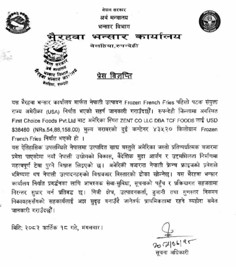 रुपन्देहीमा अवस्थित फस्ट च्वाइस फुड्स् प्रालिबाट अमेरिकास्थित जेन्टको एलएलसी डिबिए टिसिएफ फुड्स् लाई नेपाली रु ५४ लाख ८८ हजार १५८ मूल्य बराबरको दुई कन्टेनर ४३५२० किलोग्राम फ्रोजन फ्रेन्च फ्राइज निर्यात भएको भैरहवा भन्सार कार्यालयले जनाएको छ ।