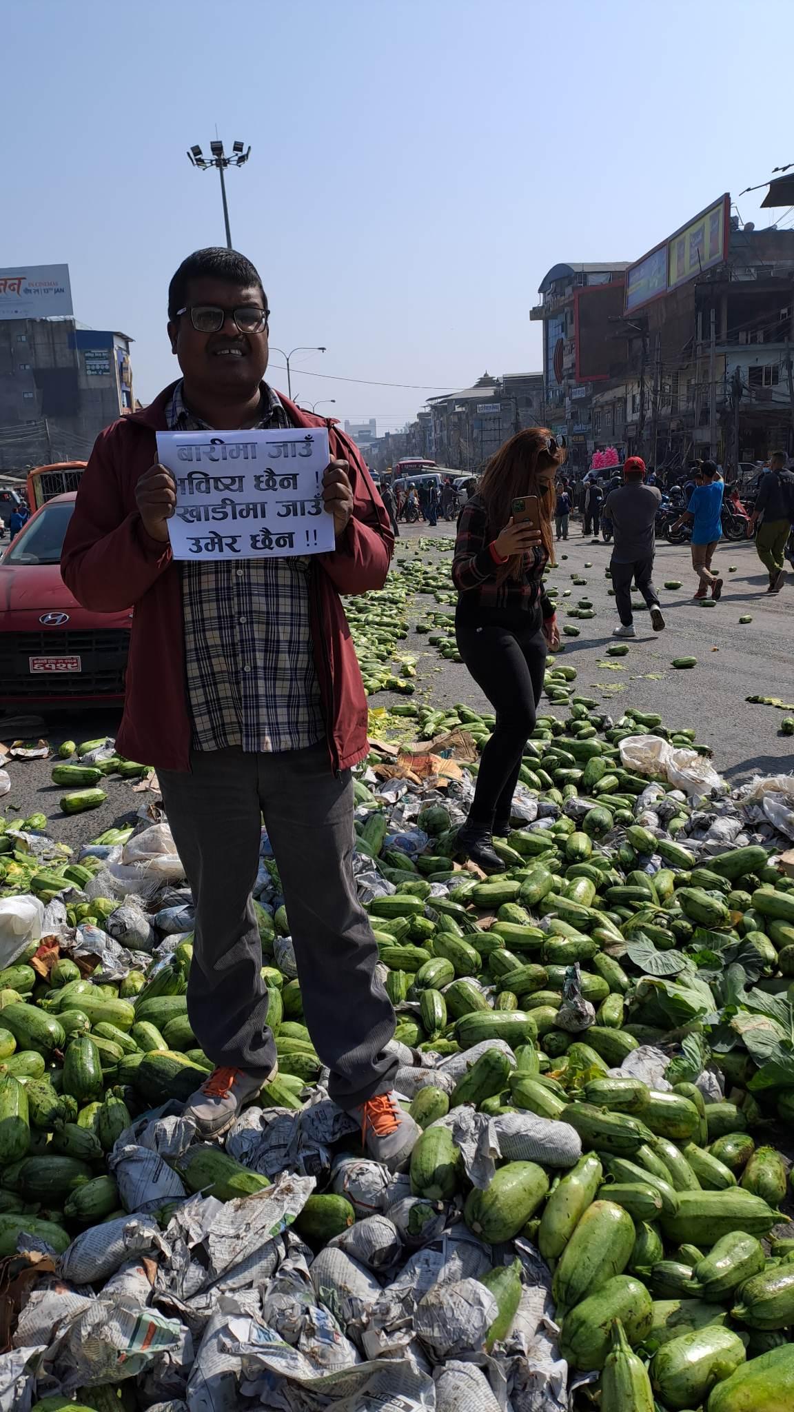 ‘बजार मूल्य त पाइने अवस्था छैन नै तरकारी खेतमै सड्ने अवस्था भयो, त्यसैले आन्दोलन गरेका हौं’ किसान महतोले भने, ‘उपभोक्ताको भान्सामा सस्तो मूल्यमा पुगेको भए त चित्त बुझाउँथ्यौ तर यहाँ त न हामीले मूल्य पाउने न त उपभोक्ताले सस्तोमा पाउने अवस्था भयो ।’ (तस्विर कृषक पुरन महतोबाट)