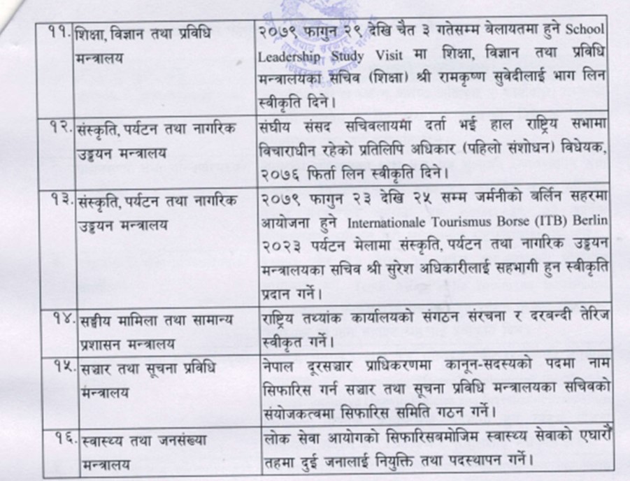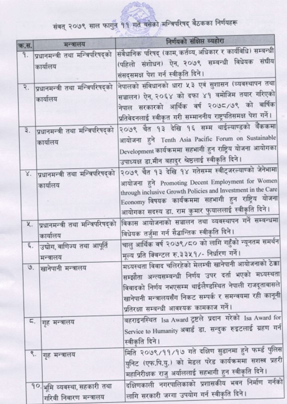बैठकले राष्ट्रिय योजना आयोगका उपाध्यक्ष मीनबहादुर श्रेष्ठलाई थाइल्यान्डमा हुने दिगो विकाससम्बन्धी दशौं एसिया प्यासिफिक फोरममा सहभागी हुन स्वीकृति दिएको छ भने विकास आयोजनाको सञ्चालन तथा व्यवस्थापन गर्ने सम्बन्धी विधेयक तर्जुमा गर्न सैद्धान्तिक स्वीकृत दिएको छ ।