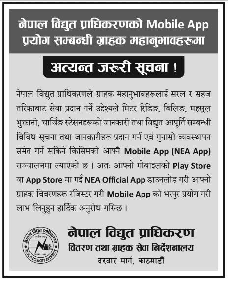 काठमाडौं । नेपाल विद्युत प्राधिकरणले मोबाइल एप ‘एनइए’ एप सञ्चालनमा ल्याएको छ ।