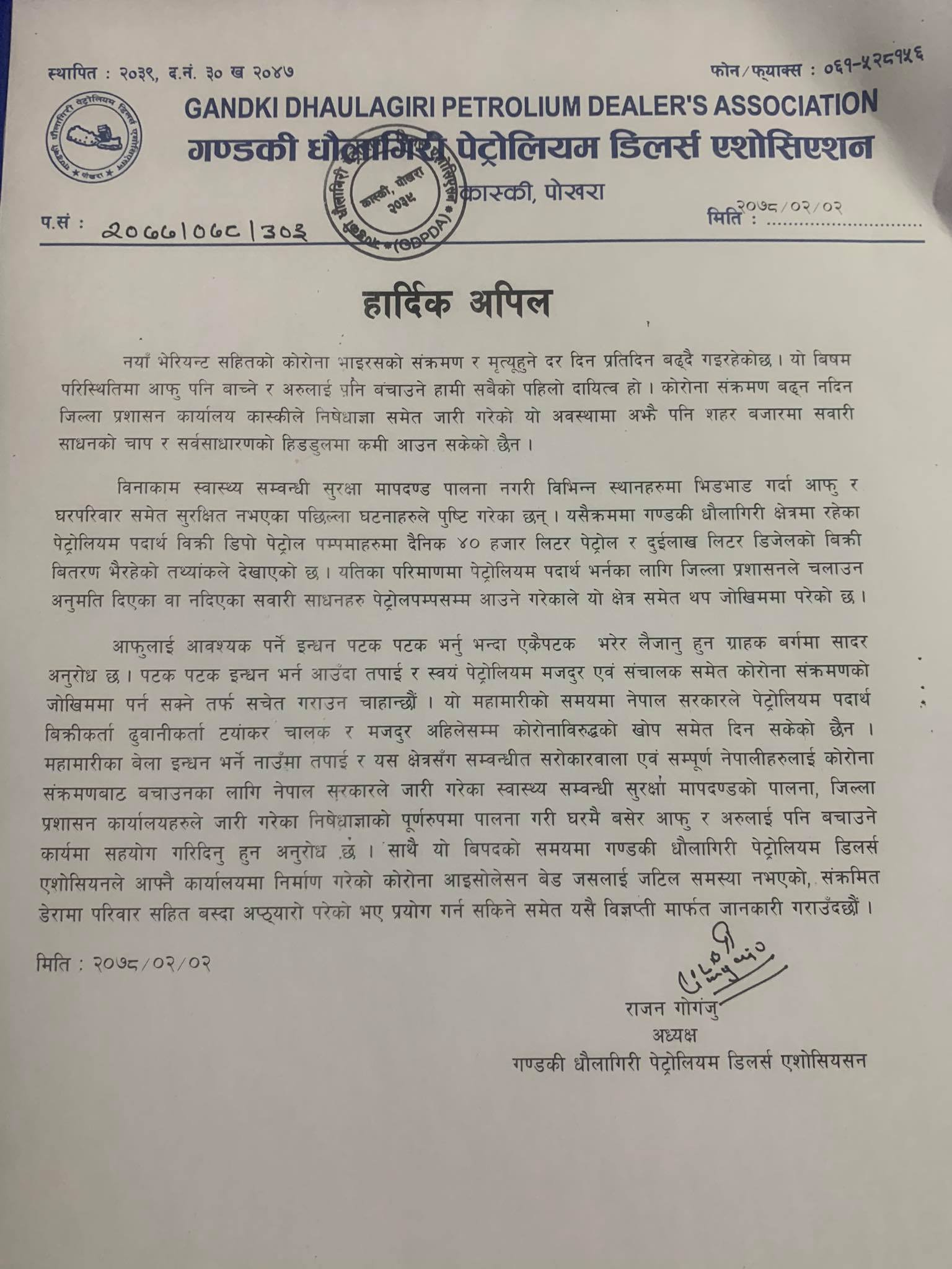 आफुलाई आवश्यक पर्ने इन्धन पटक पटक भर्नुभन्दा एकैपटक भरेर लैजान गण्डकी धौलागिरी पेट्रोलियम डिलर्स एशोसियसनले अनुरोध गरेको छ । पटक पटक इन्धन भर्न आउँदा ग्राहक र स्वयं पेट्रोलियम मजदुर एवं संचालक समेत कोरोना संक्रमणको जोखिममा पर्नसक्नेतर्फ सचेत गराउन एशोसिएसनले सो आग्रह गरेको अध्यक्ष राजन गोगंजुले बताए ।