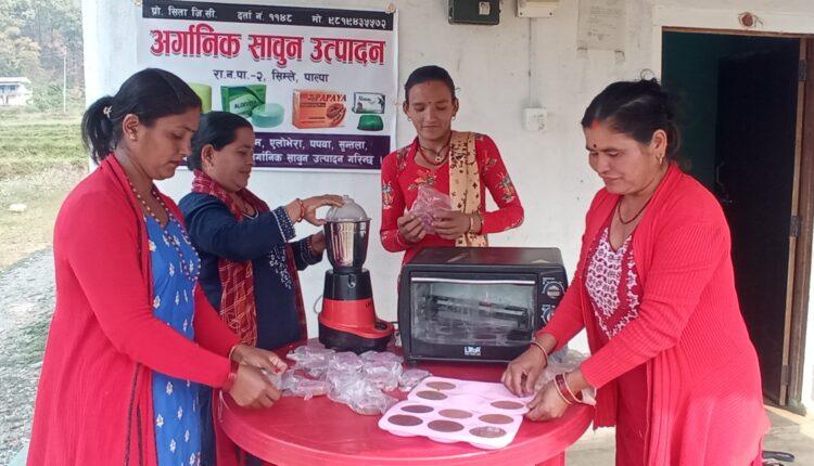 रामपुर नगरपालिका–२ स्थित सिम्लेमा ‘अग्र्यानिक साबुन उद्योग’का नाममा समूहमा महिलाले नुहाउने साबुन तयार पारिरहेका छन् । साबुन बनाउने छ दिनको तालिम नगरपालिकाले दिएपश्चात समूहमा मिलेर अहिले साबुन बनाउन थालेको अध्यक्ष सीता घर्ती बताउछिन् । “स्थानीय उत्पादन भएकाले गाउँघरकै ग्राहकले खरिद गरिरहनुभएको छ, गाउँमा राम्रै खपत भइरहेको छ”, उनले भनिन् ।
