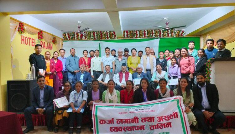 बागलुङ । राष्ट्रिय सहकारी बैंक लिमिटेड बागलुङ शाखाले आयोजना गरेको २ दिने कर्जा लगानी तथा असुली व्यवस्थापन तालिम बुधवार सम्पन्न भएको छ । सहकारीले सदस्यहरुलाई ऋण लगानी गर्दा अपनाउनु पर्ने विधिहरु, आवश्यक कागजातहरु, धितो मूल्यांकन, जमानत लगायत संभावित जोखिम कम गर्न सहयोग पु¥याउने उद्देश्यका साथ तालिम सञ्चालन गरिएको बैंकले जनाएको छ ।