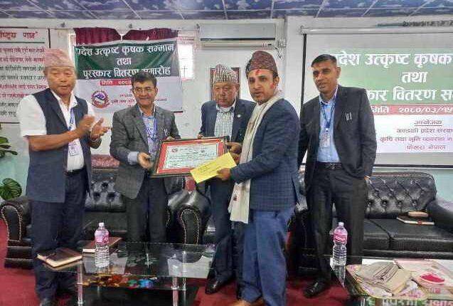 उक्त पुरस्कारको राशि रु ३० हजार रहेको छ । धान दिवसको अवसरमा शुक्रबार आयोजित कार्यक्रममा मन्त्री महेन्द्रध्वज जिसीले उक्त पुरस्कार प्रदान गरेका हुन् । कृषि तथा पशुपालनको क्षेत्रमा पु¥याएको योगदानको कदर गर्दै उक्त पुरस्कार प्रदान गरिएको हो ।