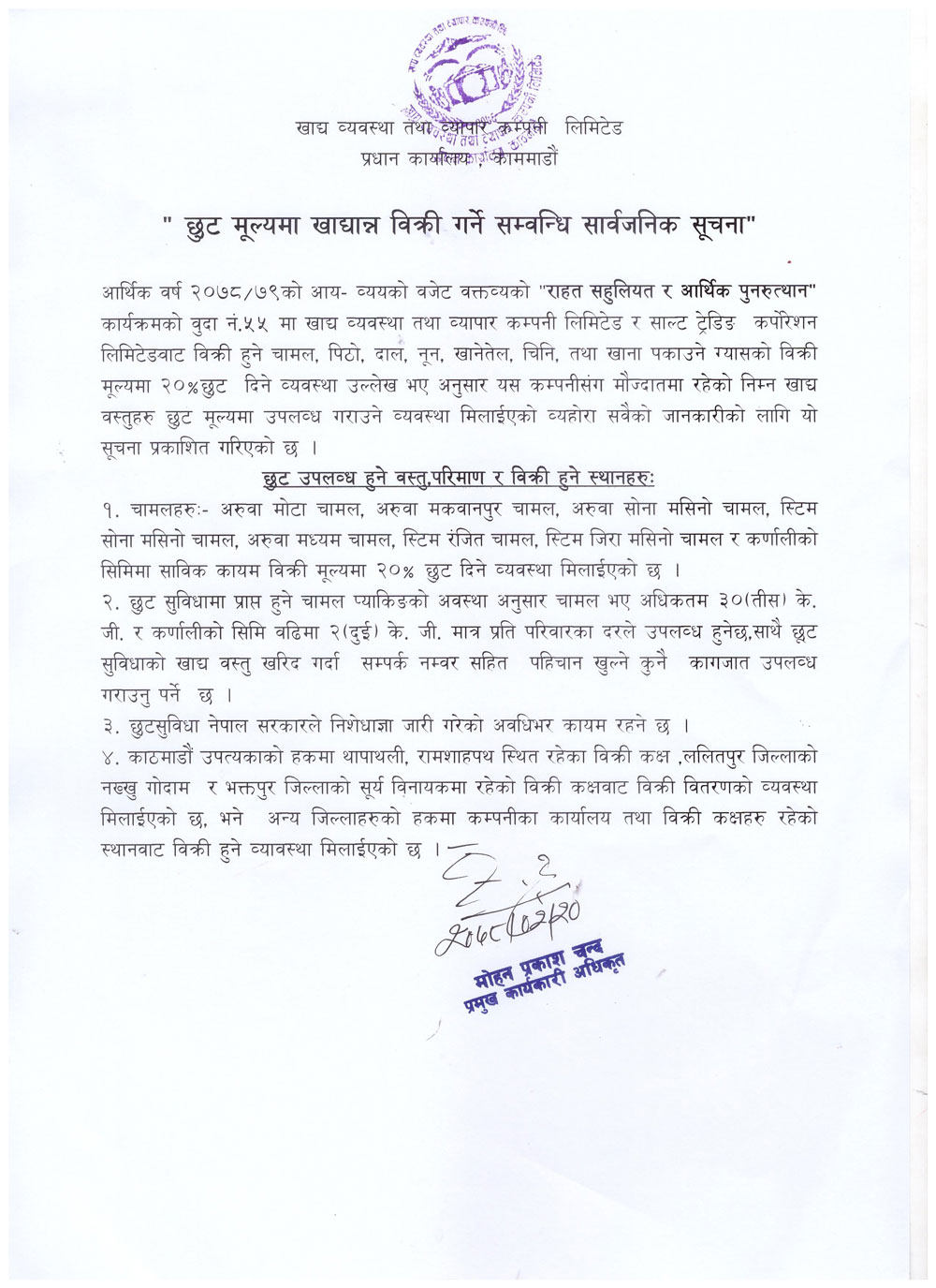 काठमाडौं । अर्थमन्त्री विष्णु पौडेलले बजेट भाषणमै ग्यास र खाद्यान्नमा २० प्रतिशत छुट दिने नीति सुनाए । निशेधाज्ञा लागु भएका ठाउँमा निशेधाज्ञा अवधिभर सर्वसाधरणलाई राहत स्वरुप छुट दिने भनेर ल्याइएको यो नीतिको देशभरबाट स्वागत भयो । सरकारको यही नीति अुनसार साल्ट ट्रेडिङ कर्पोरेसन लिमिटेड र खाद्य व्यवस्था तथा व्यापार कम्पनीले २० प्रतिशत छुटमा ग्यास तथा खाद्यान्न बिक्री सुरु गरेको सूचना नै सार्वजनिक गरेका छन् ।
