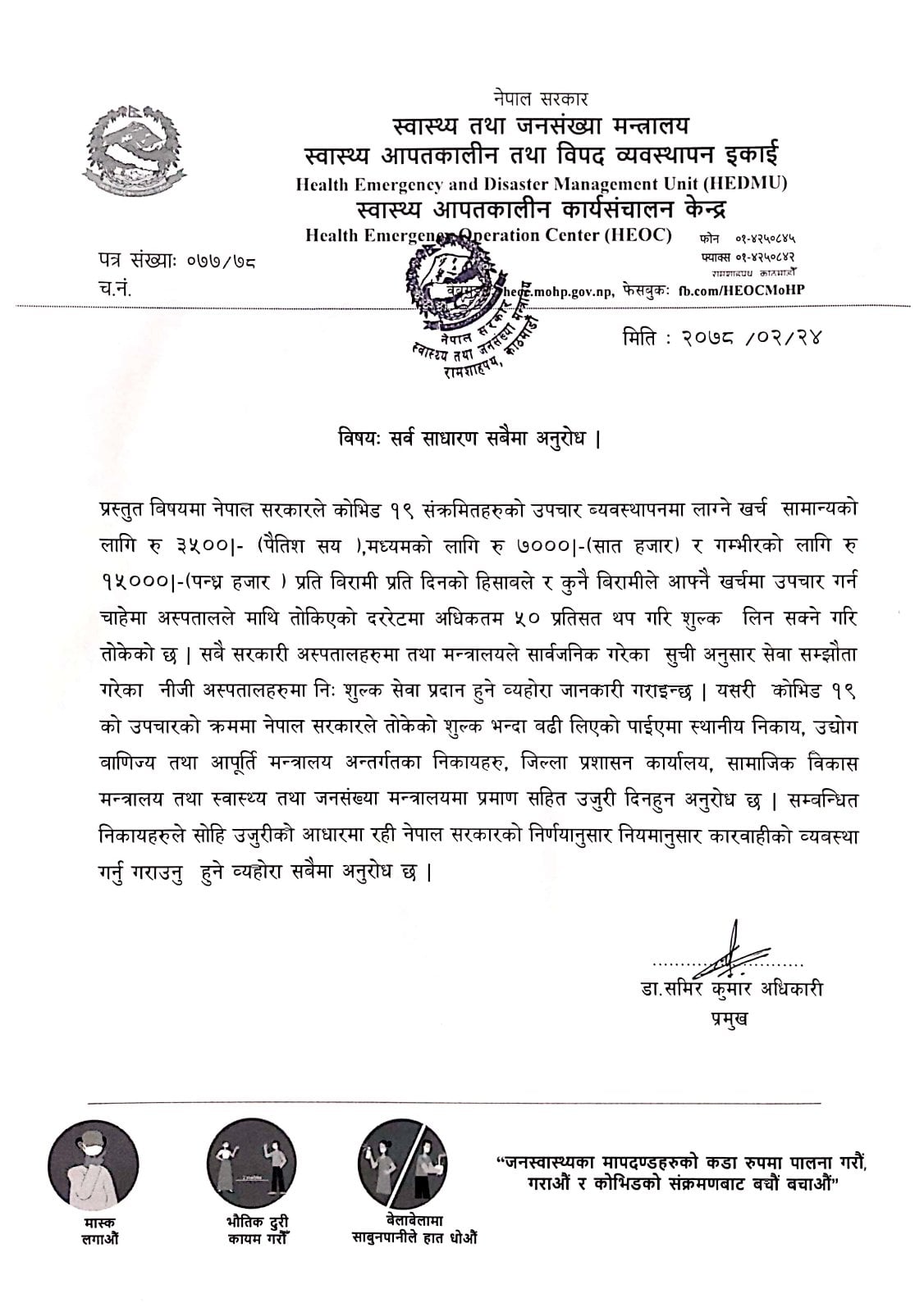 सरकारले सङ्क्रमितको उपचार व्यवस्थापनका लागि सामान्य बिरामीलाई रु तीन हजार ५०० प्रतिदिन, मध्यमबिरामीका लागि रु सात हजार प्रतिदिन र गम्भिर प्रकृतिका बिरामीलाई रु १५ हजार प्रतिदिन तोकेको छ ।