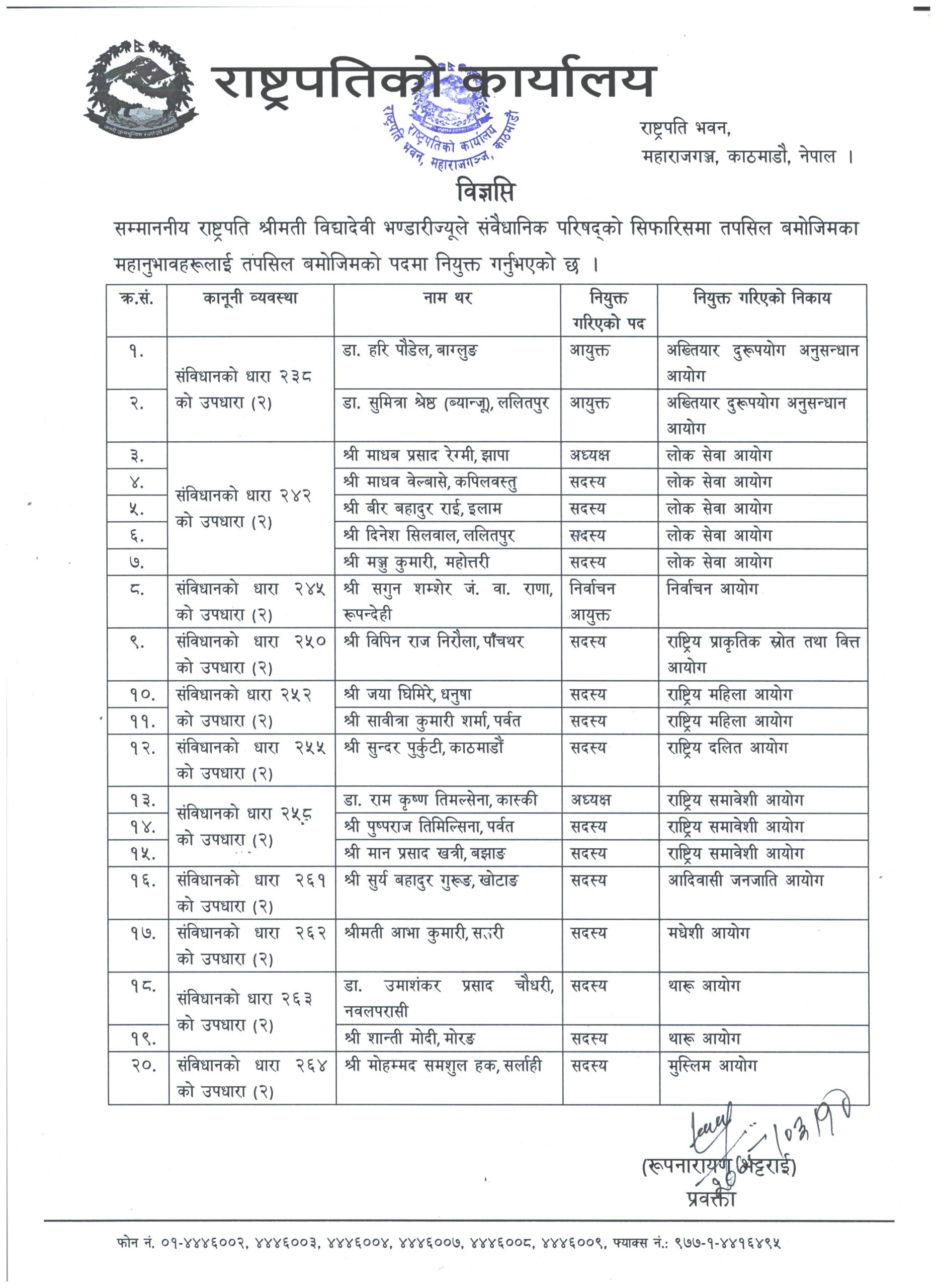 राष्ट्रपति भण्डारीले संवैधानिक परिषद्ले ४५ दिनअघि सिफारिश गरेका २० पदाधिकारीलाई आज नियुक्त गर्नुभएको राष्ट्रपतिको कार्यालयका प्रवक्ता रुपनारायण भट्राईले जारी गरेको विज्ञप्तिमा जनाइएको छ ।