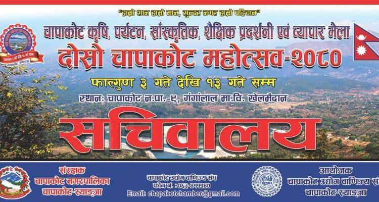 काठमाडौं । स्याङ्जाको चापाकोट नगरपालिकामा आजदेखि दोस्रो चापाकोट महोत्सव एवं व्यापार मेला २०८० सुरु हुदैछ ।