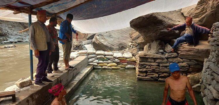 गलेश्वर (म्याग्दी) । म्याग्दीको रघुगङ्गा गाउँपालिका–४, दर्मिजामा रहेका प्राकृतिक तातोपानीका कुण्ड वर्षौंदेखि त्रिपालको ओतमुनि रहेको छ । तातोपानी कुण्डमा डुबेर उपचार गराउने बिरामीमा त्यहाँसम्म जान बाटो र कुण्डमा भौतिक पूर्वाधार निर्माण भए पनि कुण्डमा जस्तापाताको छाना नहाल्दा त्रिपालको ओतमुनि बसेर बिरामीहरु तातोपानी कुण्डमा डुब्न वा स्नान गर्न बाध्य छन् ।