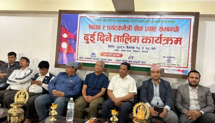 होटल व्यवसायी महासंघ गण्डकी प्रदेशको आयोजना र म्याग्दी होटल तथा रेष्टुराँ संघको सहआयोजनामा शनिबारदेखि सुरु तालिम आइतबार सम्पन्न भएको हो । व्यवसायी र कर्मचारीहरुलाई स्वच्छ र पर्यटकमैत्री सेवा प्रवाहसम्बन्धी तालिममा कालीगण्डकी करिडोर अन्तर्गतका पर्वत, बागलुङ, मुस्ताङ, म्याग्दी आसपासका समेत गरी ६० जना पर्यटनकर्मी सहाभागी थिए ।