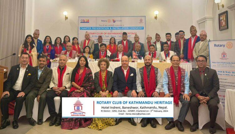 रोटरी इन्टरनेशनल डिष्ट्रिक्ट ३२९२ का डिष्ट्रिक्ट गभर्नर राजेन्द्र ध्वजुले एक कार्यक्रमबीच क्लब चार्टड प्रस्तुतीकरण गरी क्लबसका सदस्यहरुको पदस्थापना गराएका हुन् । रोटरी क्लब अफ काठमाडौं हेरिटेजका डिष्ट्रिक्टकै कान्छो क्लब हो ।