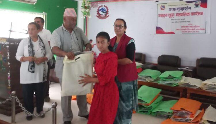 नगर क्षेत्रका १२ वटै वडाका डेढ वर्षदेखि १६ वर्षसम्मका ८२ जना अभिभावकविहीन बालबालिकालाई नगरपालिकाले अभिभावकत्व प्रदान गर्दै कपडा र झोला प्रदान गरिएको नगरप्रमुख कृष्णप्रसाद श्रेष्ठले बताए । बालबालिकालाई नगरप्रमुख श्रेष्ठ र उपप्रमुख आचार्यले कपडा र झोलाका साथ जनही रु पाँच सय पनि प्रदान गरे । रासस
