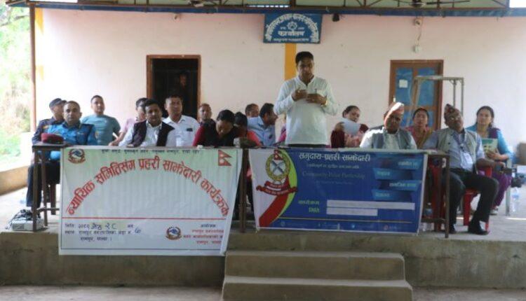 रामपुर (पाल्पा) । पाल्पाको रामपुर नगरपालिका वडा नं. ७ पाल्पामा न्यायिक समितिसंग प्रहरी साझेदारी कार्यक्रम सम्पन्न भएको छ । रामपुर नगरपालिकाको आयोजनमा समाजमा हुने विभिन्न हिंसा तथा अपराध सम्बन्धी सचेतनामूलक कार्यक्रम भएको हो ।