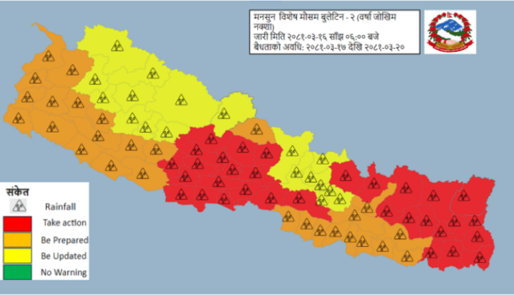 जल तथा मौसम विज्ञान विभाग, मौसम पूर्वानुमान महाशाखाका अनुसार न्यून चापीय रेखा आगामी केही दिन नेपालको दक्षिणी भाग तथा सिमाना आसपास रहने भएकाले मनसुन थप सक्रिय हुने सम्भावना कायमै रहेको हो । यही असार २० गतेसम्म आवश्यक सावधानी तथा सतर्कता अपनाउन महाशाखाले अनुरोध गरेको छ ।